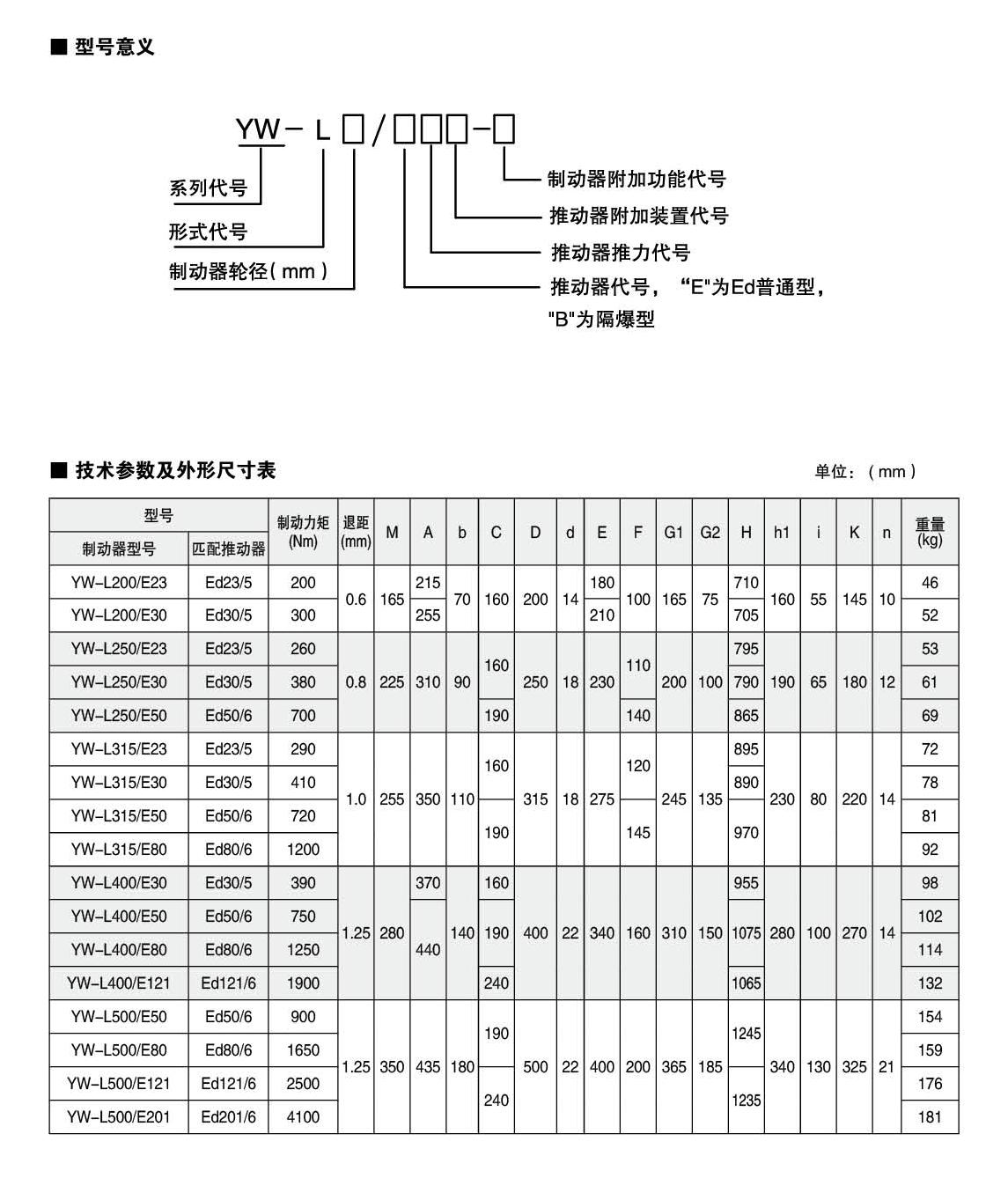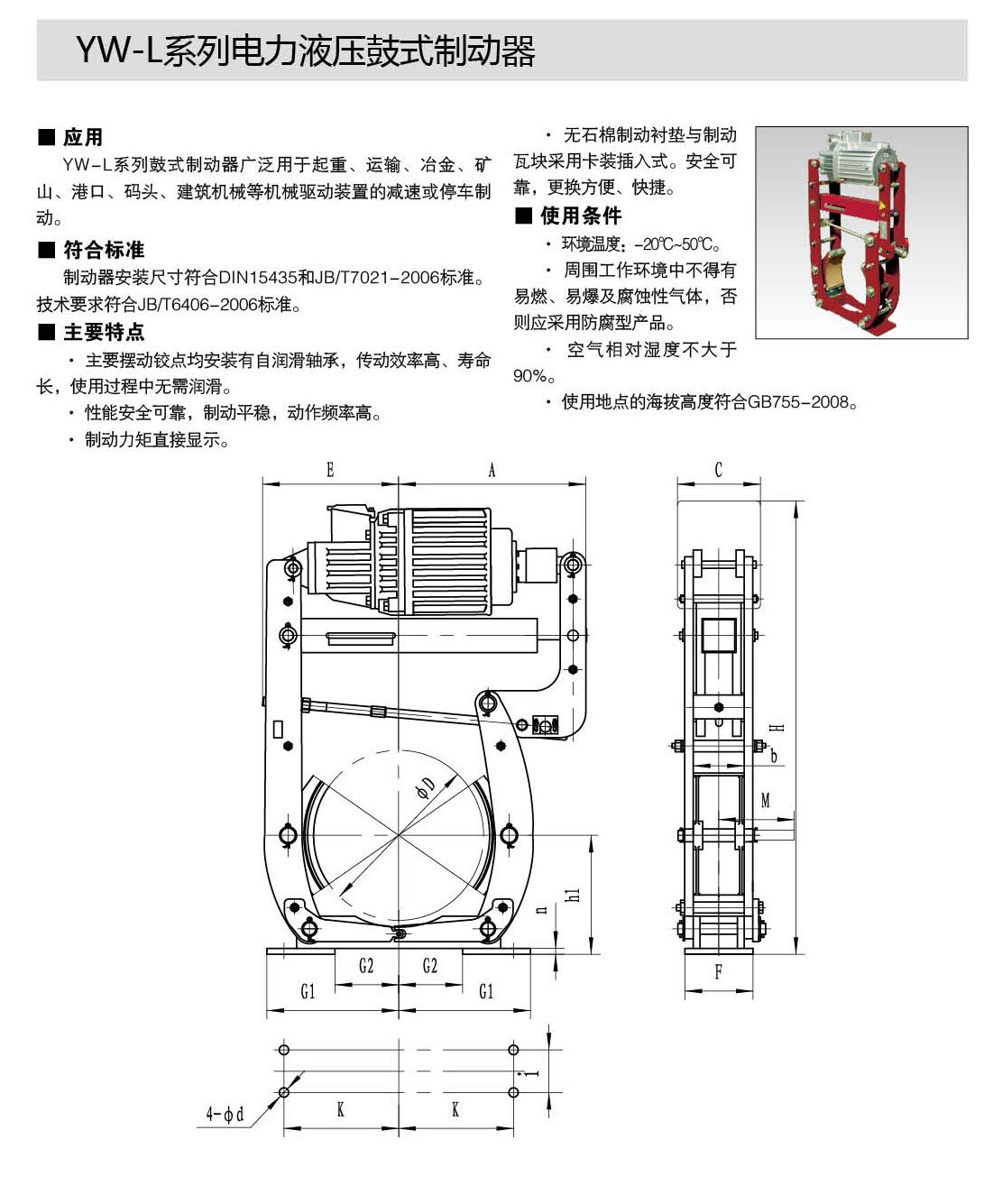 YW-L系列制動(dòng)器安裝尺寸及制動(dòng)力矩參數(shù)符合JB/T6406-2006標(biāo)準(zhǔn)和DIN15435標(biāo)準(zhǔn)。配套符合DIN15430標(biāo)準(zhǔn)的Ed系列推動(dòng)器。