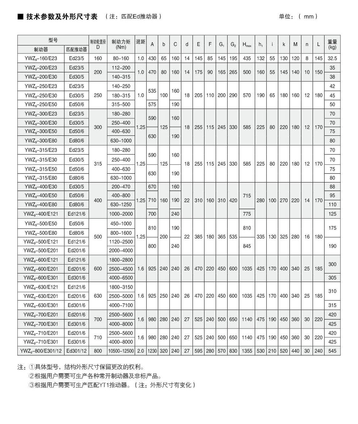 YWZ5系列電力液壓鼓式制動器的連接尺寸和制動力矩參數(shù)符合GB6333-86標準,技術要求符合JB / T6406-2006標準,配套符合DIN15430標準的Ed系列推動器。